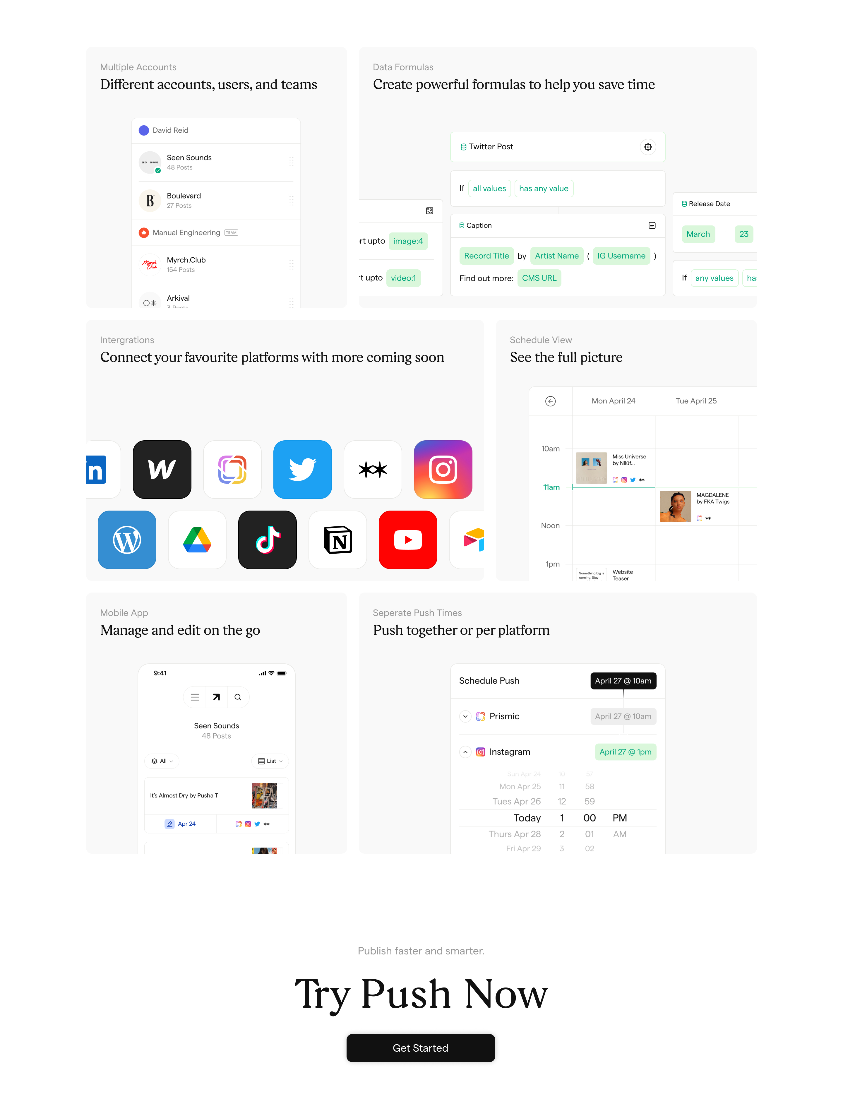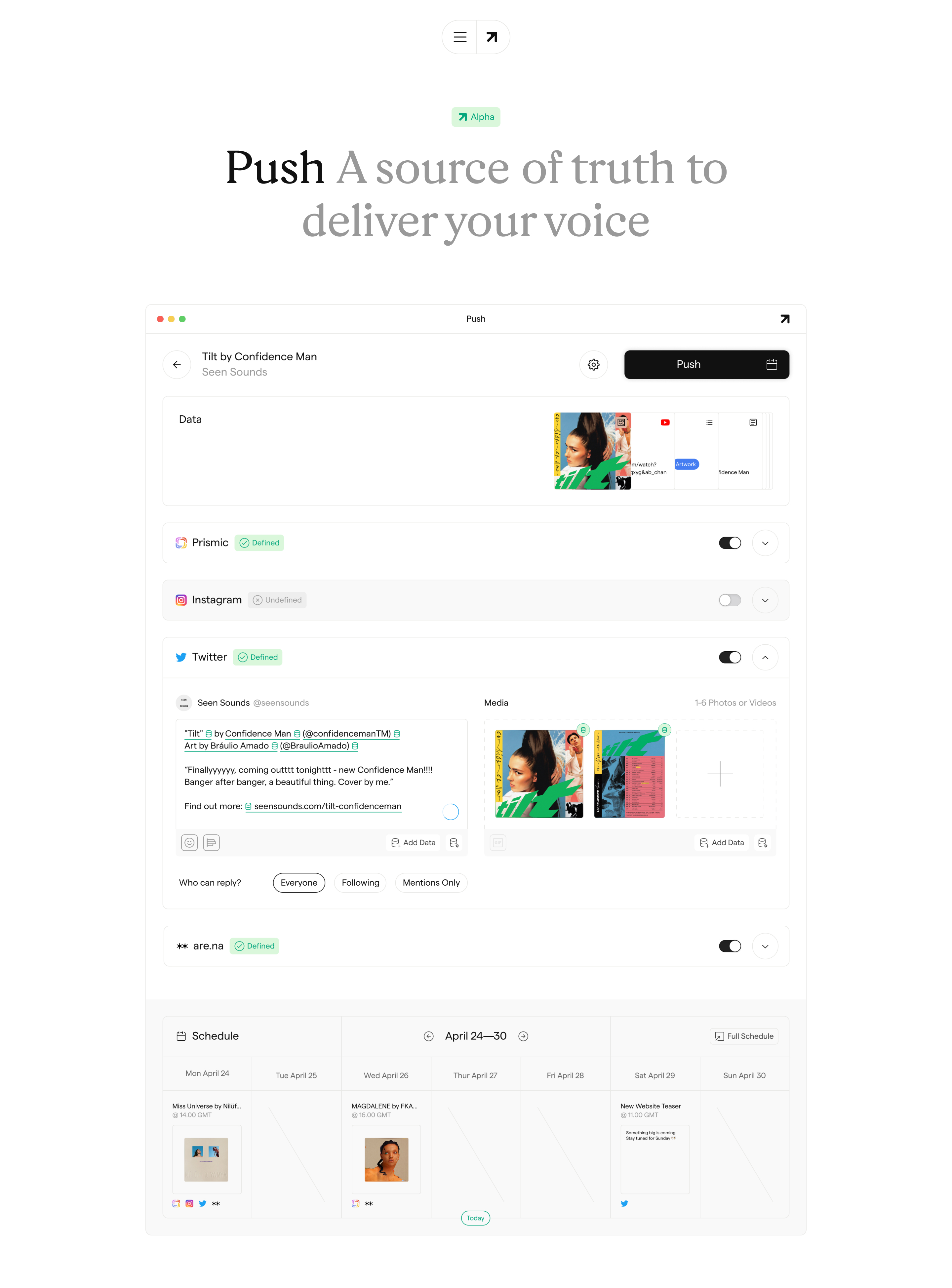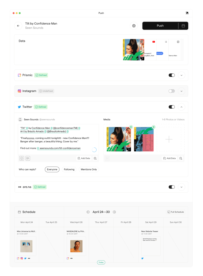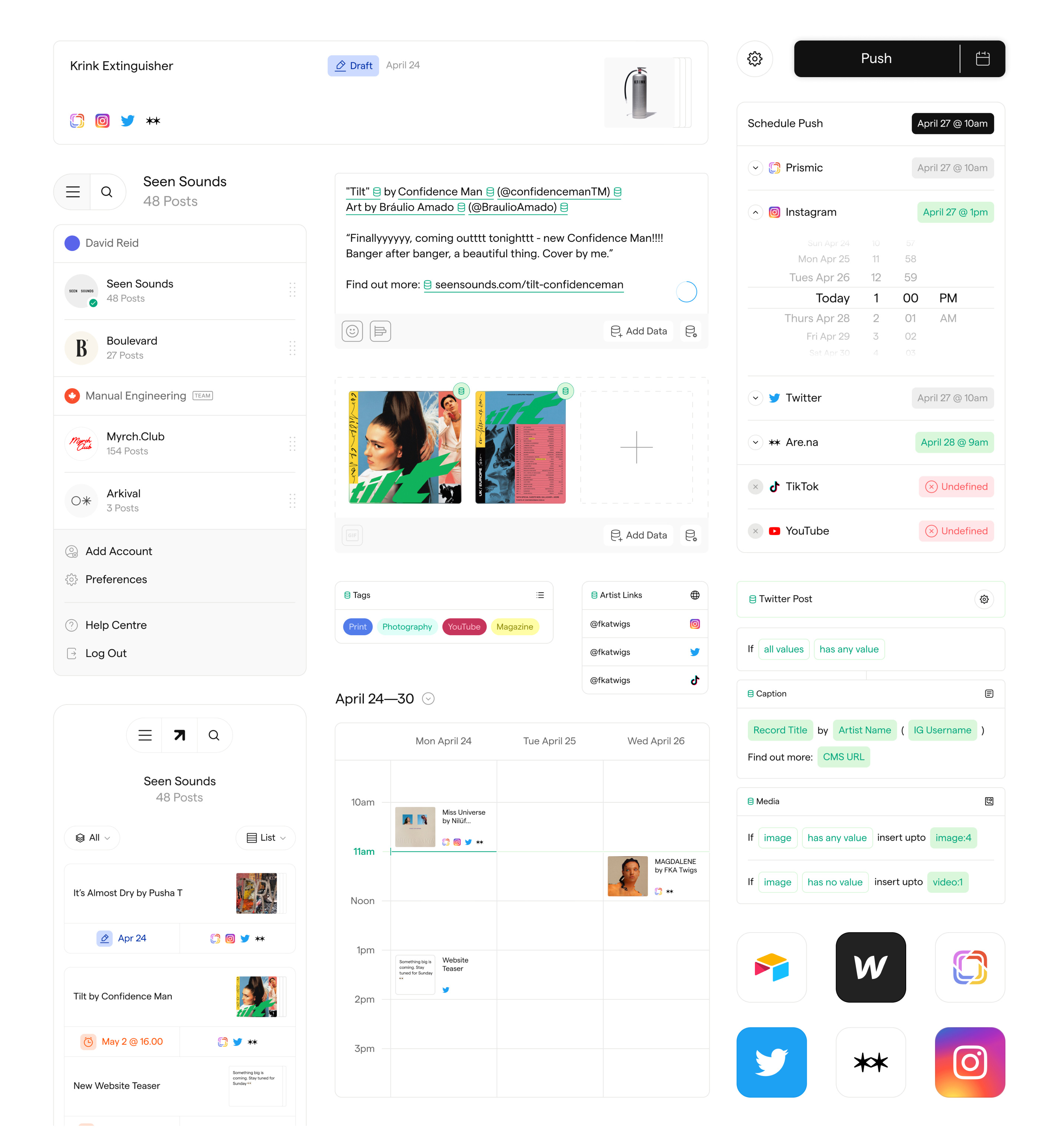 Push is a software application for desktop and mobile that acts as a single source of truth for your content data allowing you to schedule posts to various platforms such as Instagram, Twitter, Webflow, Primsic, YouTube and more.