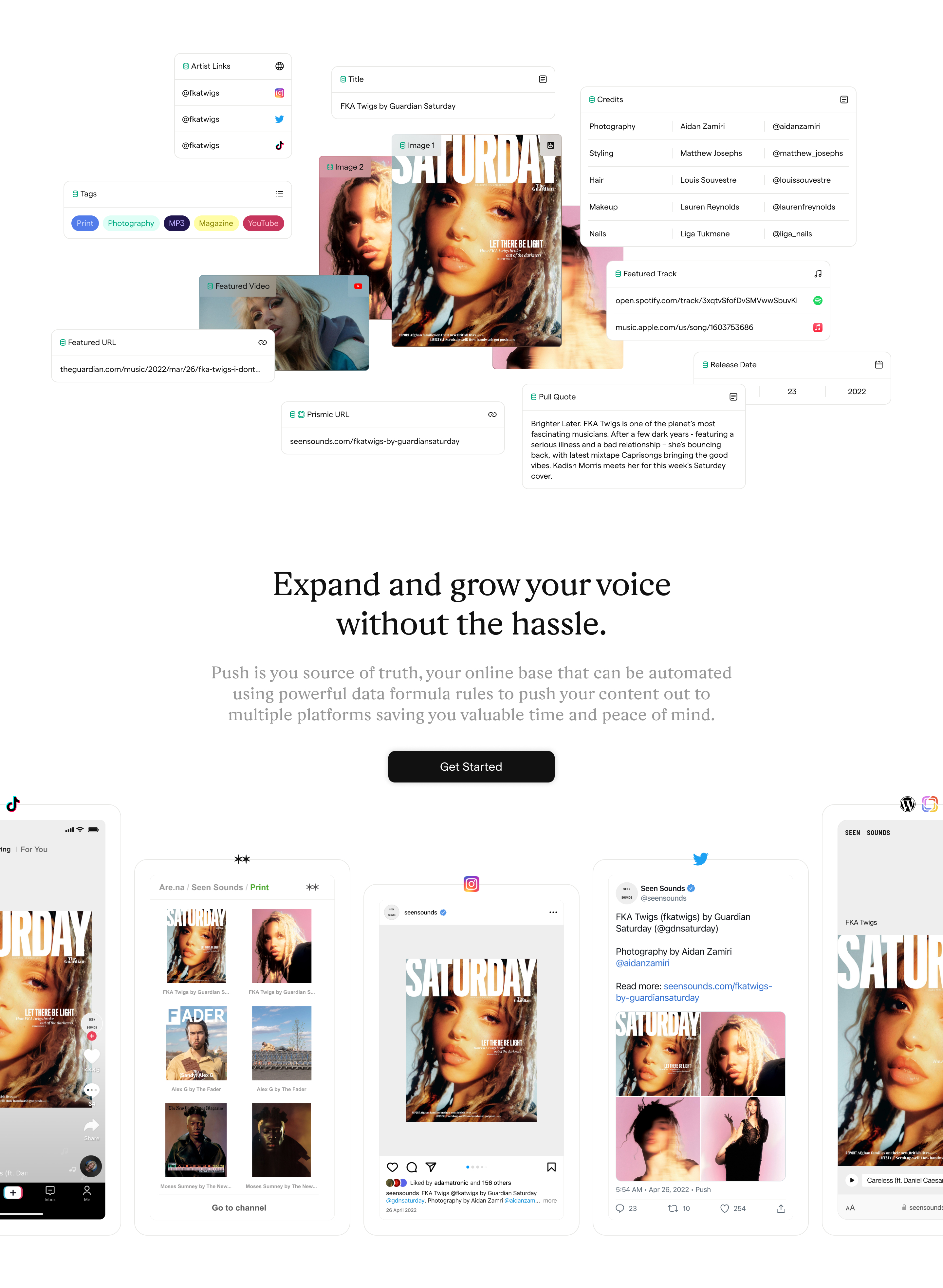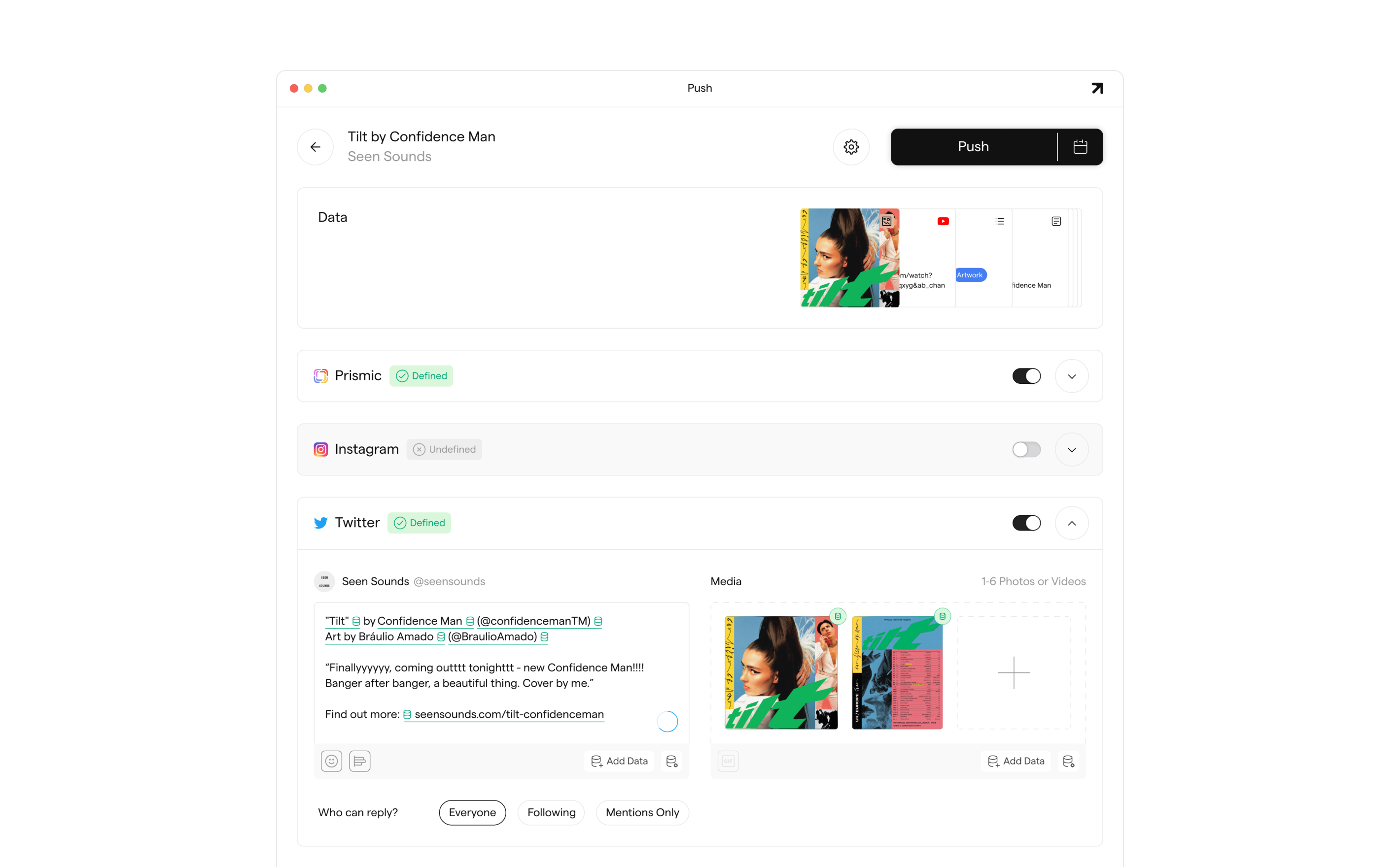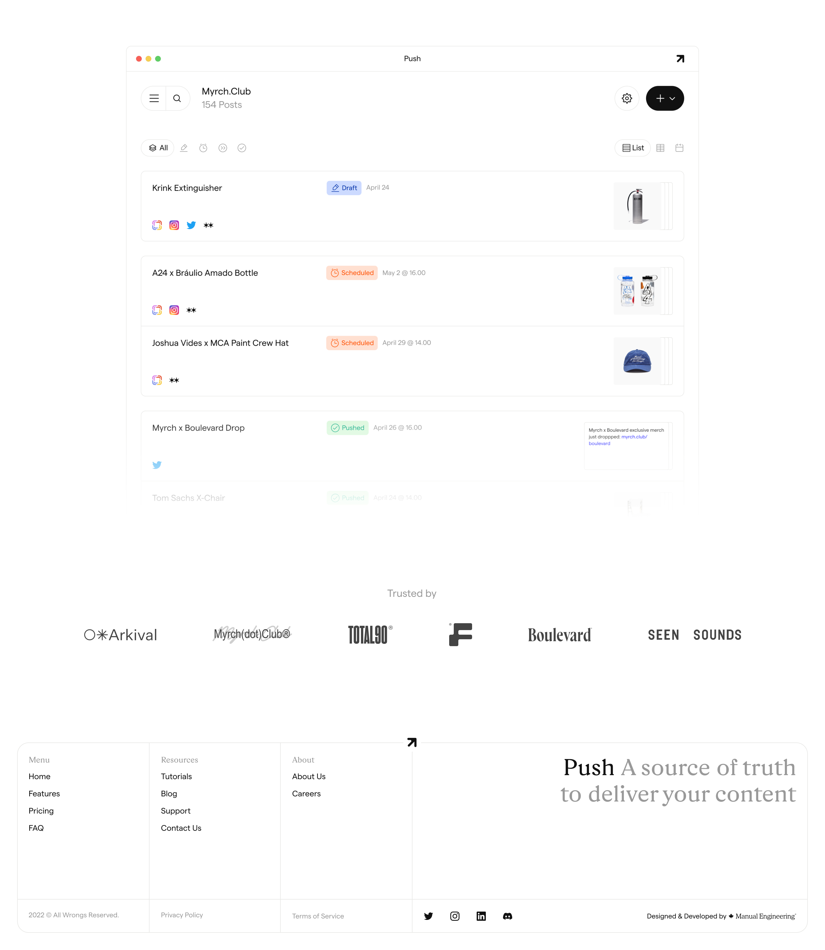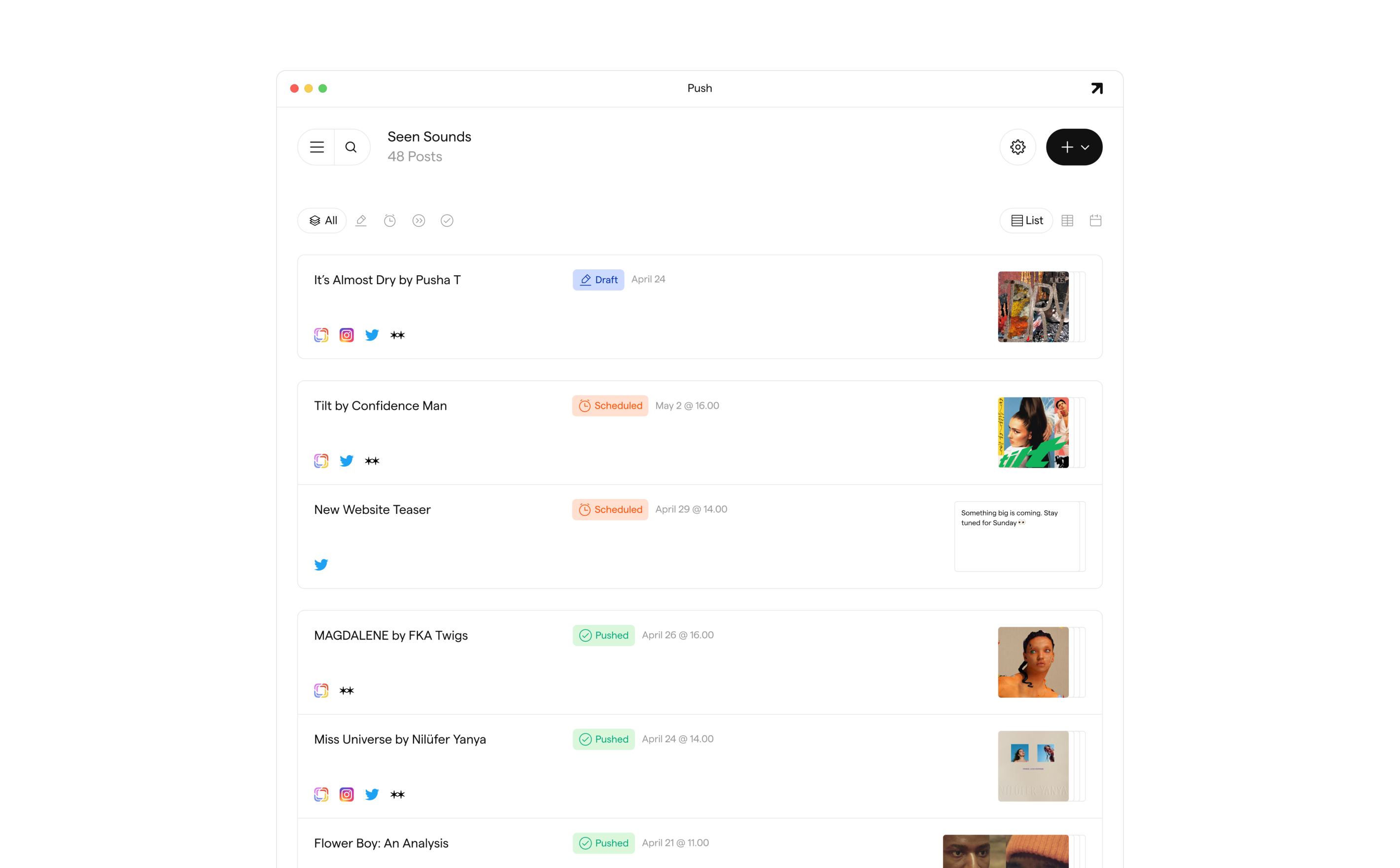 Push is a software application for desktop and mobile that acts as a single source of truth for your content data allowing you to schedule posts to various platforms such as Instagram, Twitter, Webflow, Primsic, YouTube and more.
